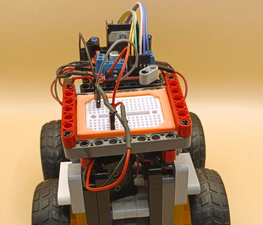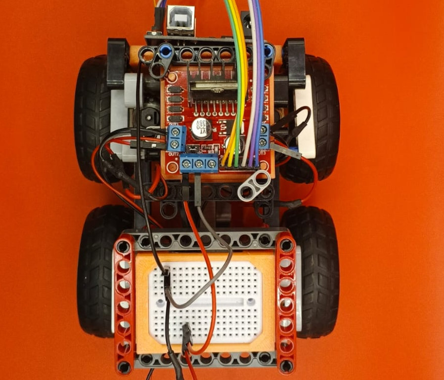 Para el nuevo chasis usamos piezas de Lego Technic conectadas a varios elementos de electrónica incluyendo 4 motoreductores para el movimiento, una mini protoboard, un controlador de motores y un Arduino.